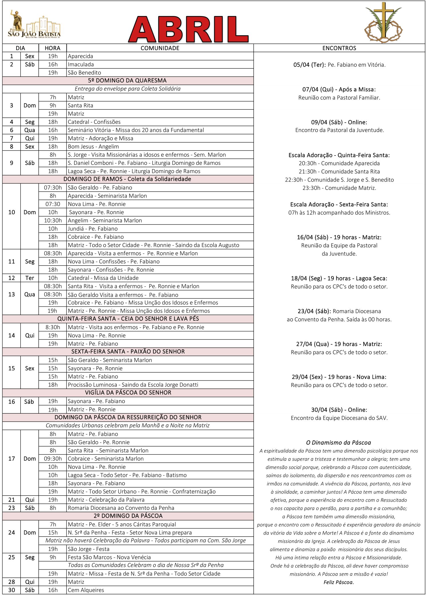 Programação Paroquial do Mês de Abril 2022