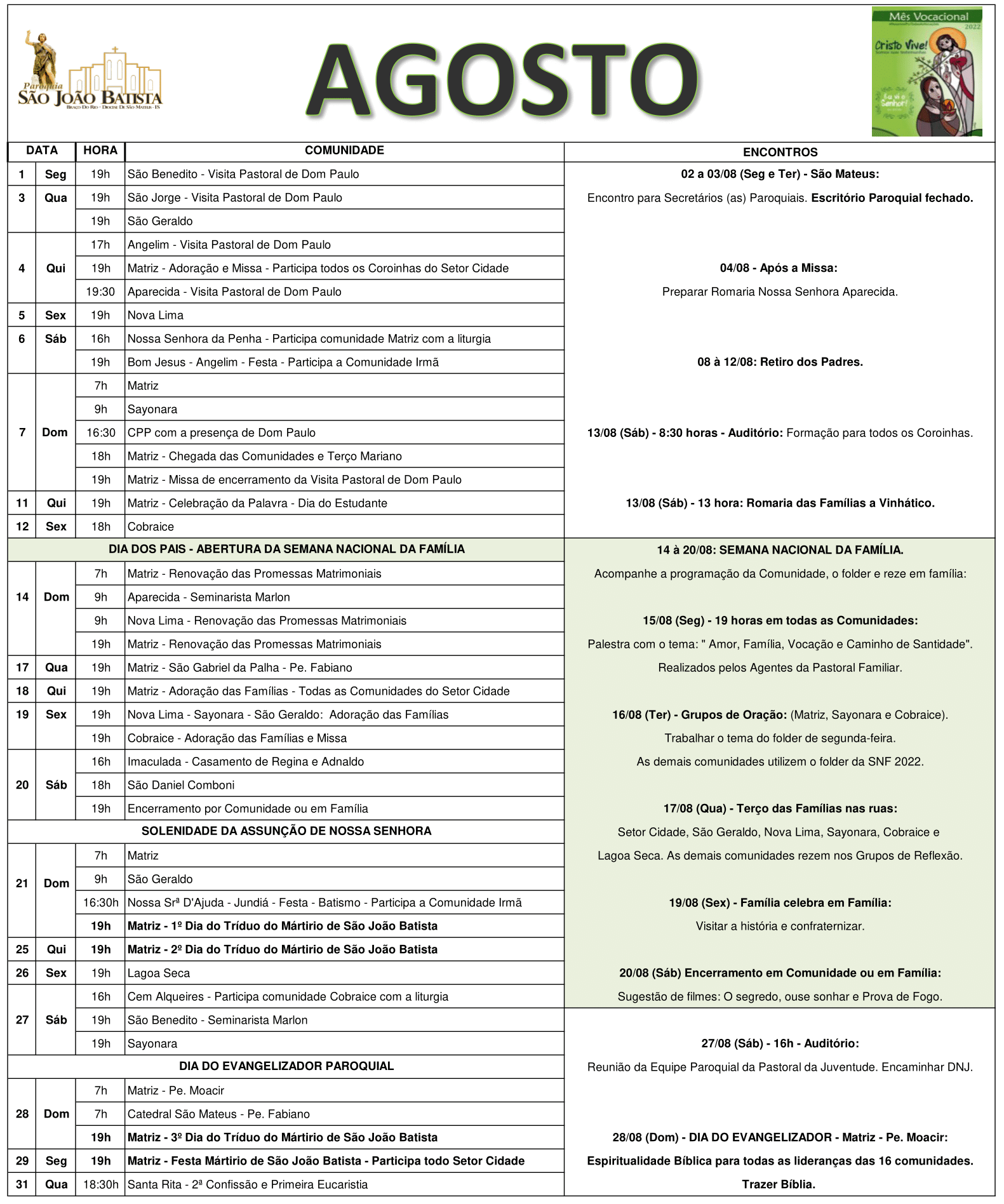 Programação Paroquial do Mês de Agosto 2022