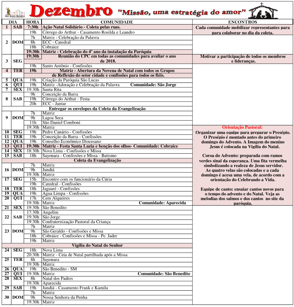 Programação Paroquial do Mês de Dezembro 2018