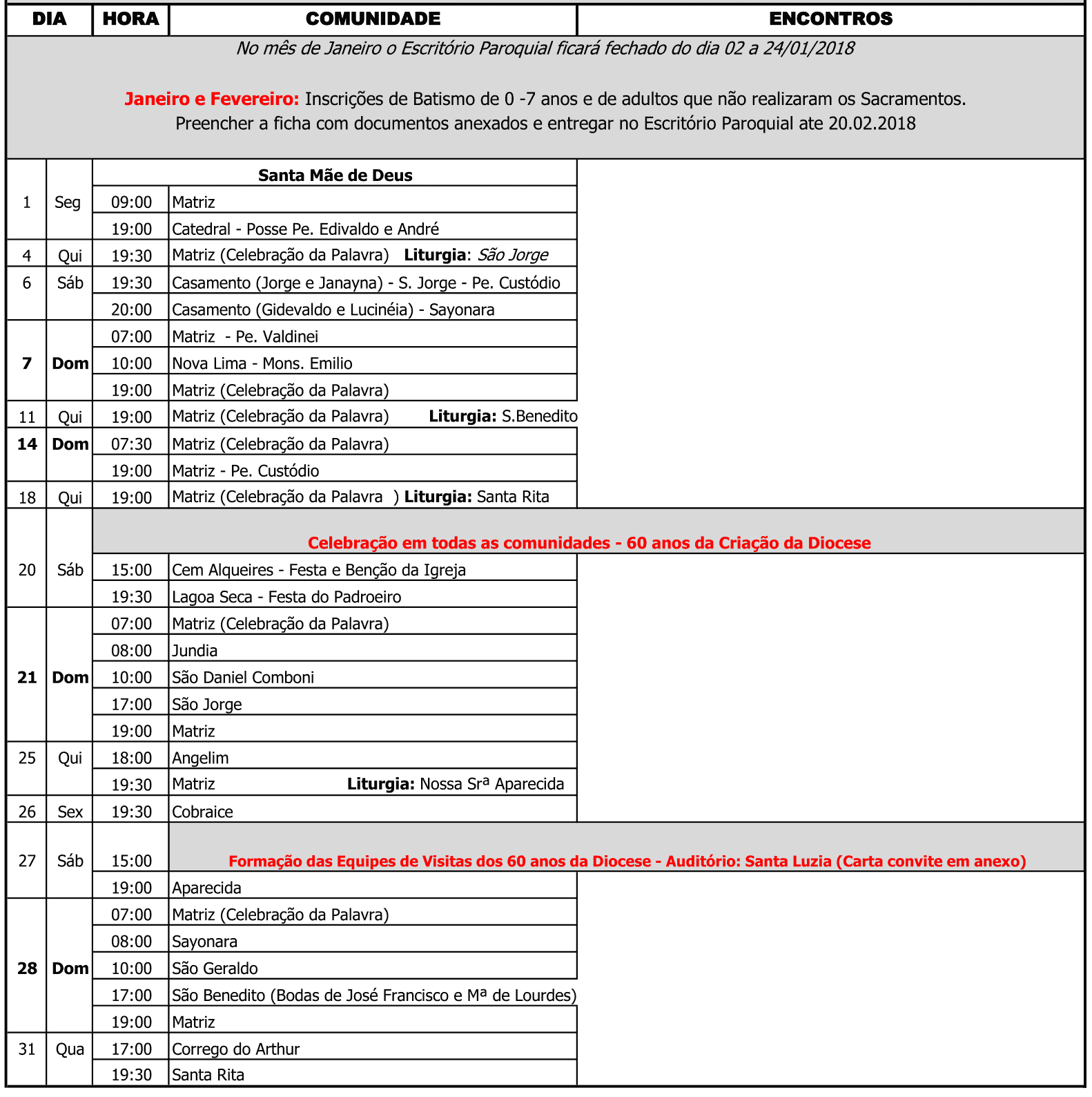 Programação Paroquial de Janeiro de 2018