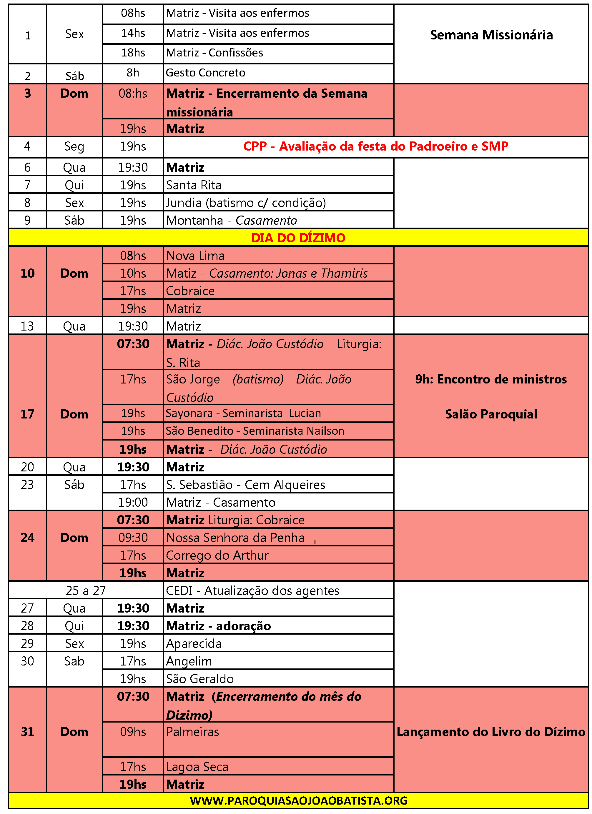 Programação Paroquial do Mês de Outubro 2025