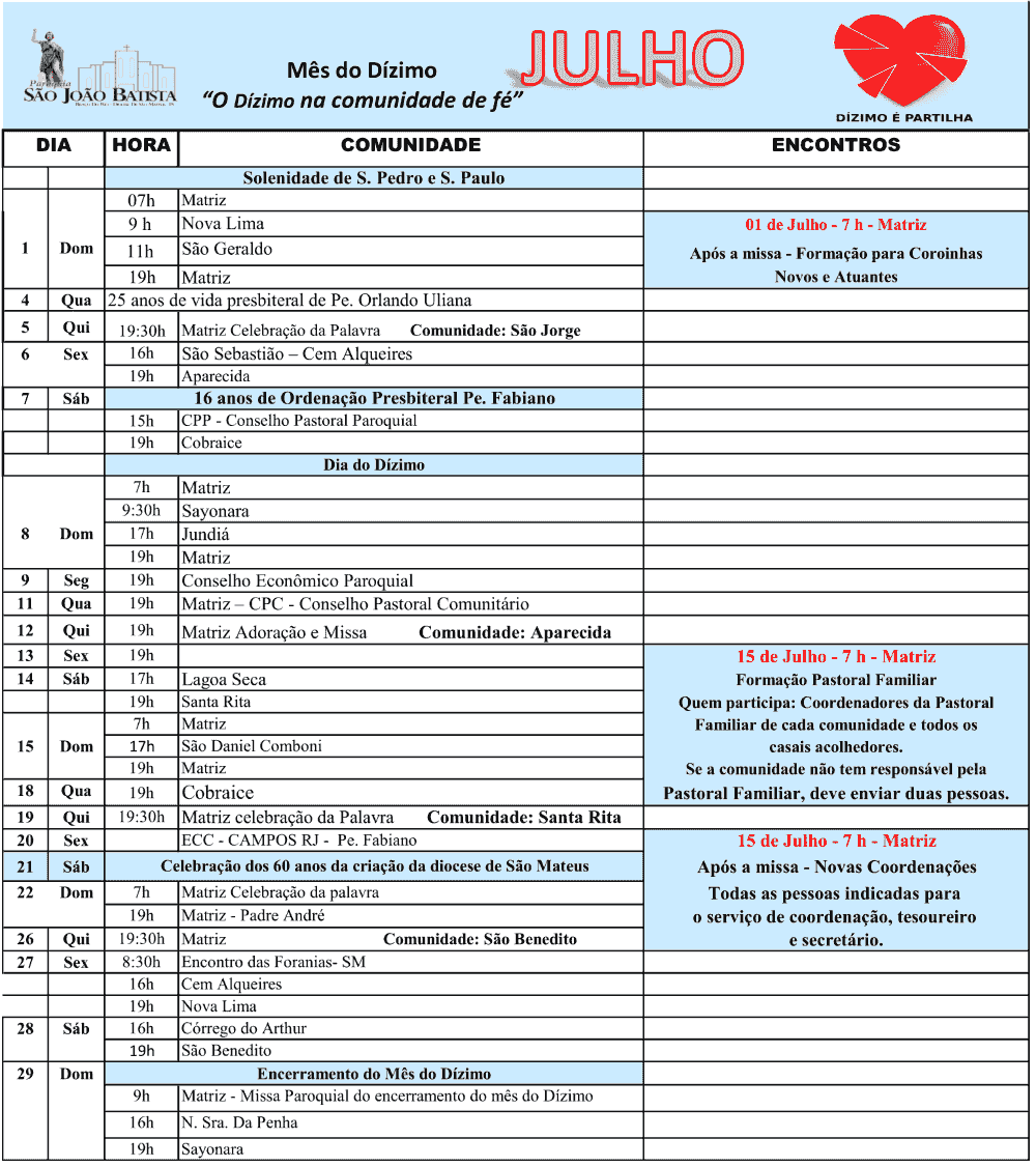 Programação Paroquial de Julho de 2018