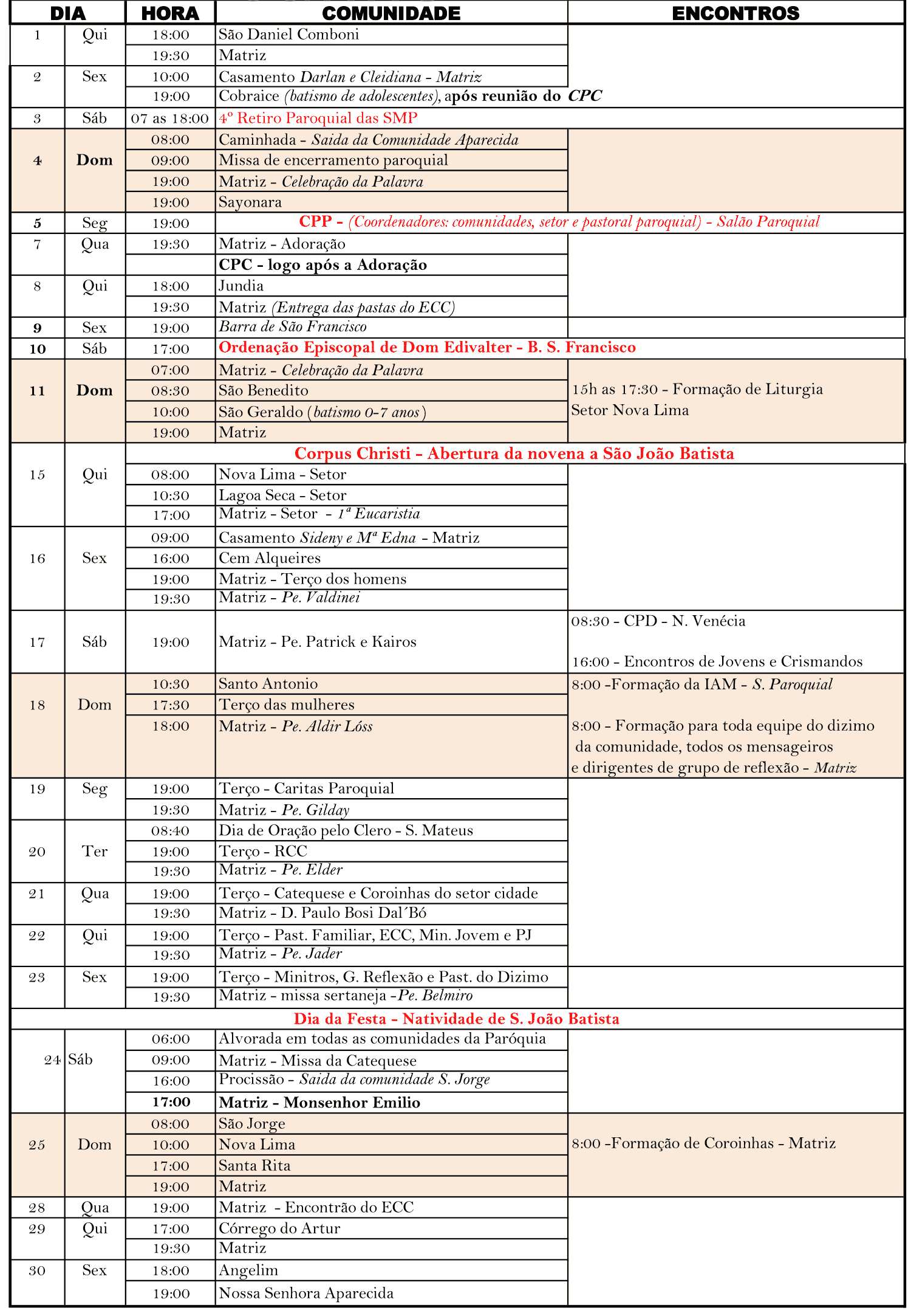 Programação Paroquial do mês de Junho de 2017