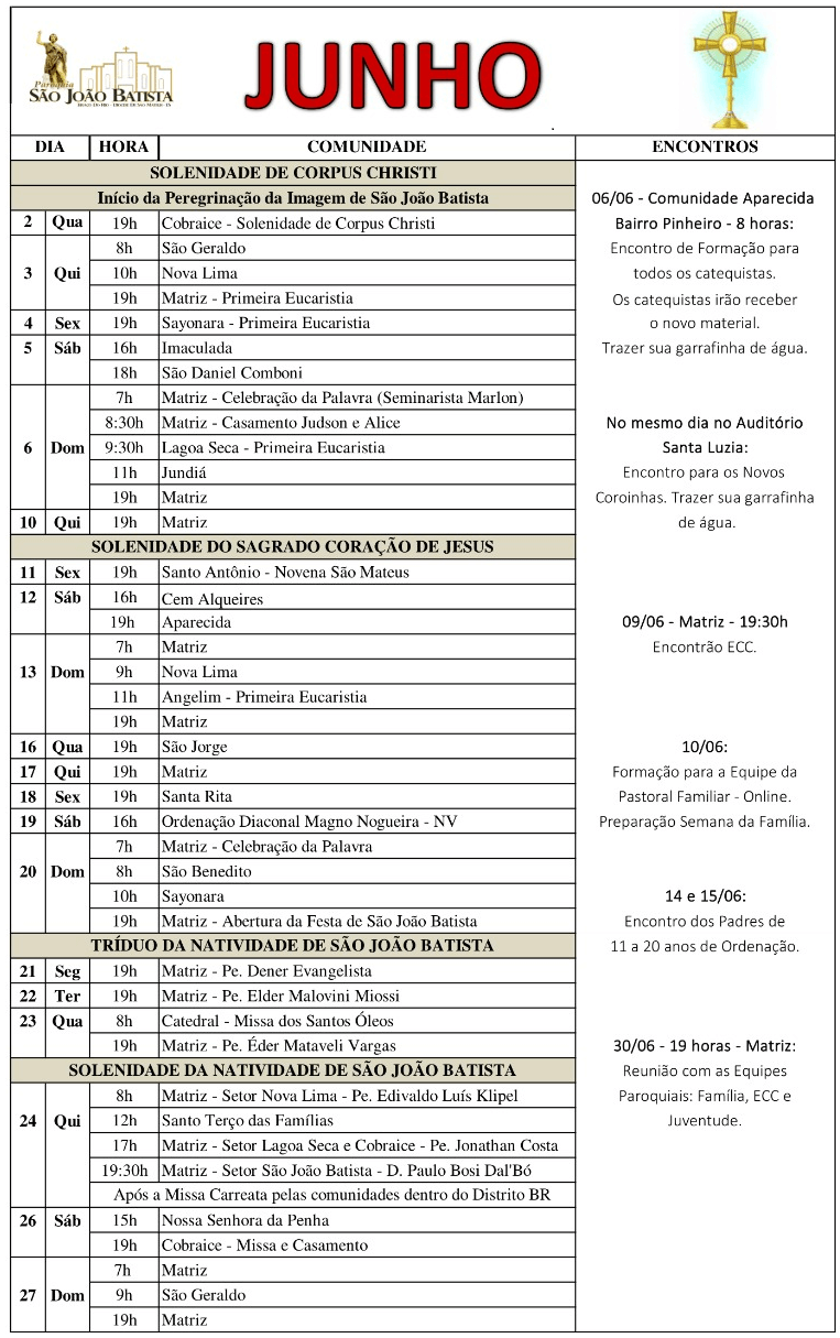 Programação Paroquial do Mês de Junho 2021