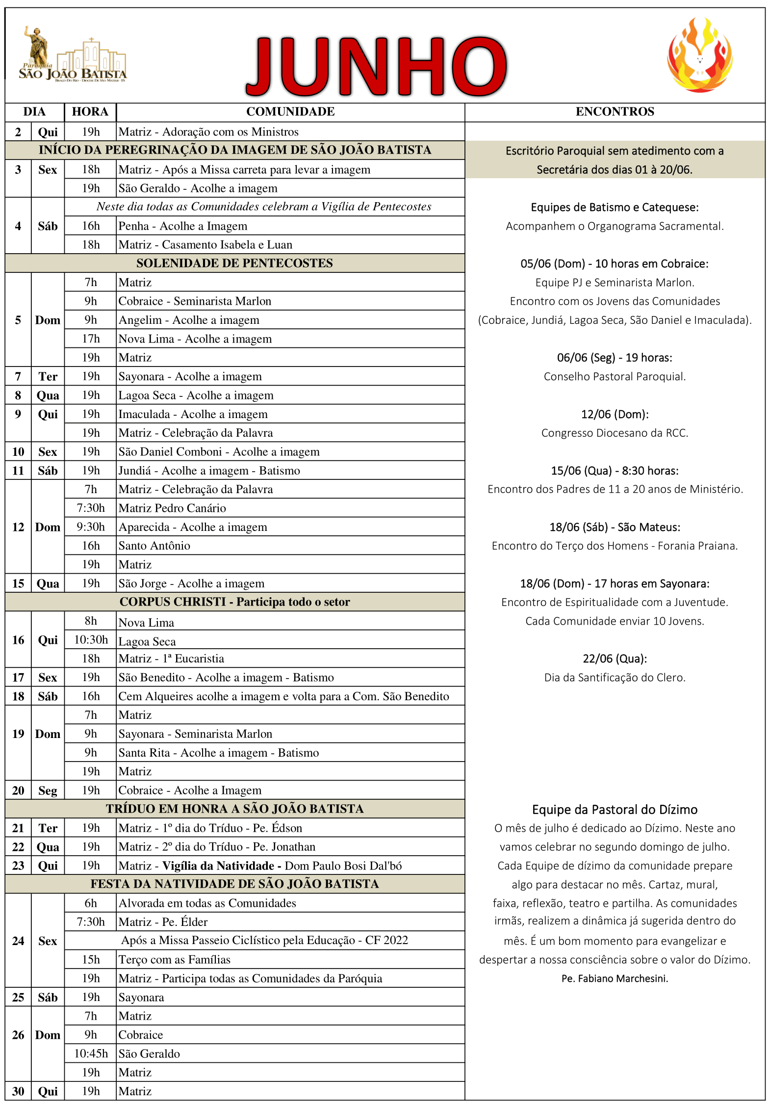 Programação do Tríduo e Festa em Honra ao Mártir São João Batista 2025
