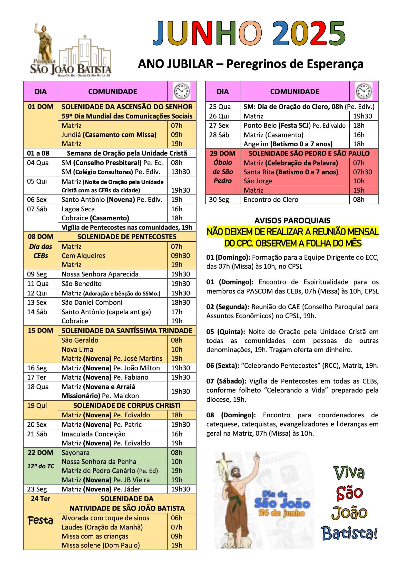 Programação do Tríduo e Festa em Honra ao Mártir São João Batista 2025