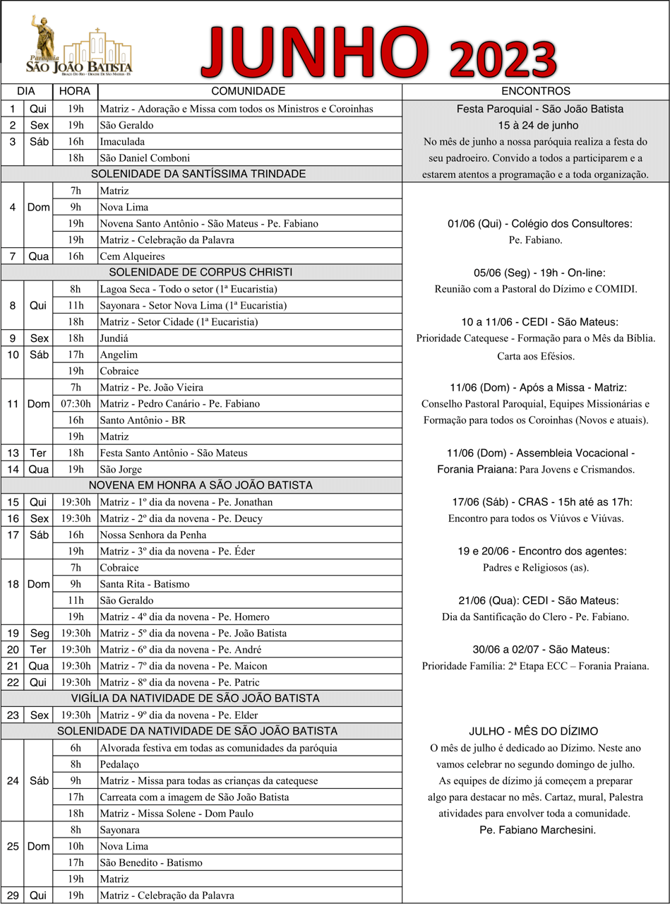 Programação do Tríduo e Festa em Honra ao Mártir São João Batista 2025