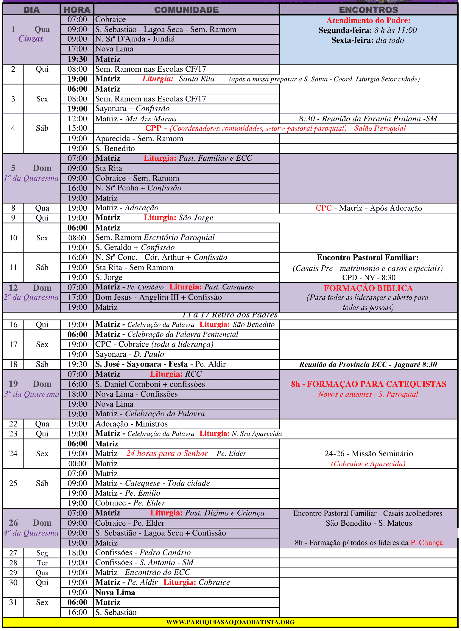 Programação Paroquial de Março 2017