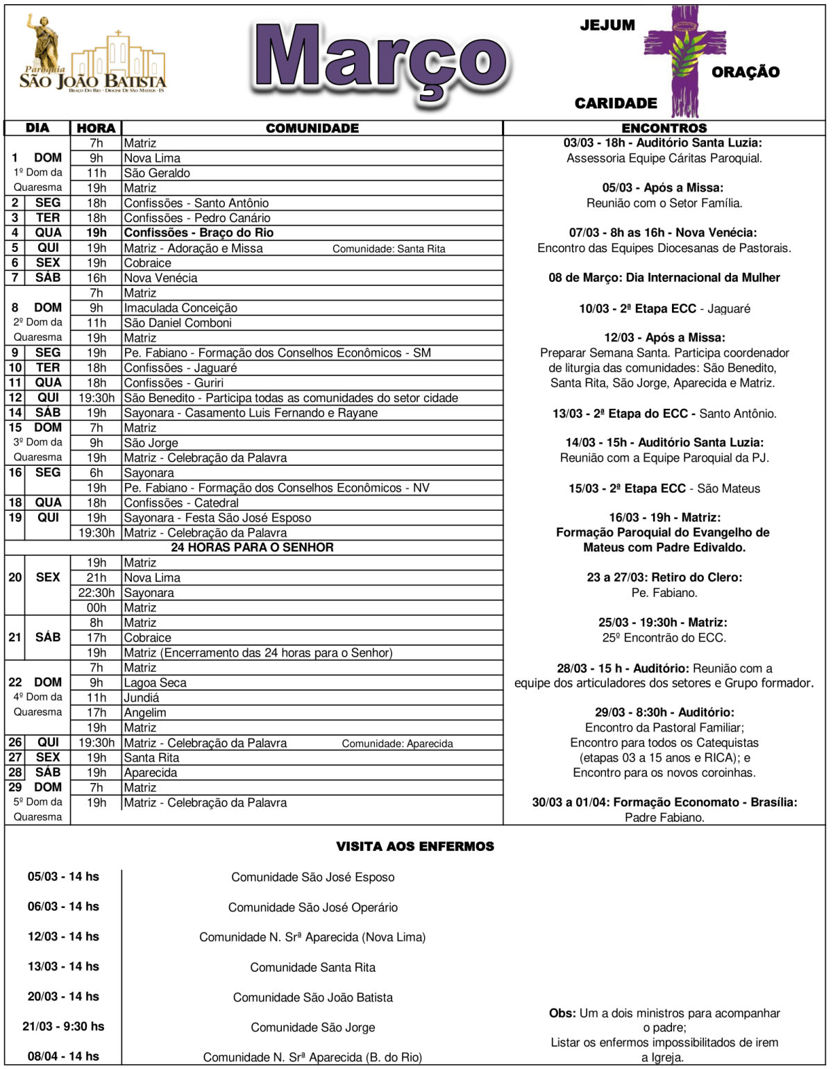 Programação Paroquial do Mês de Março 2020