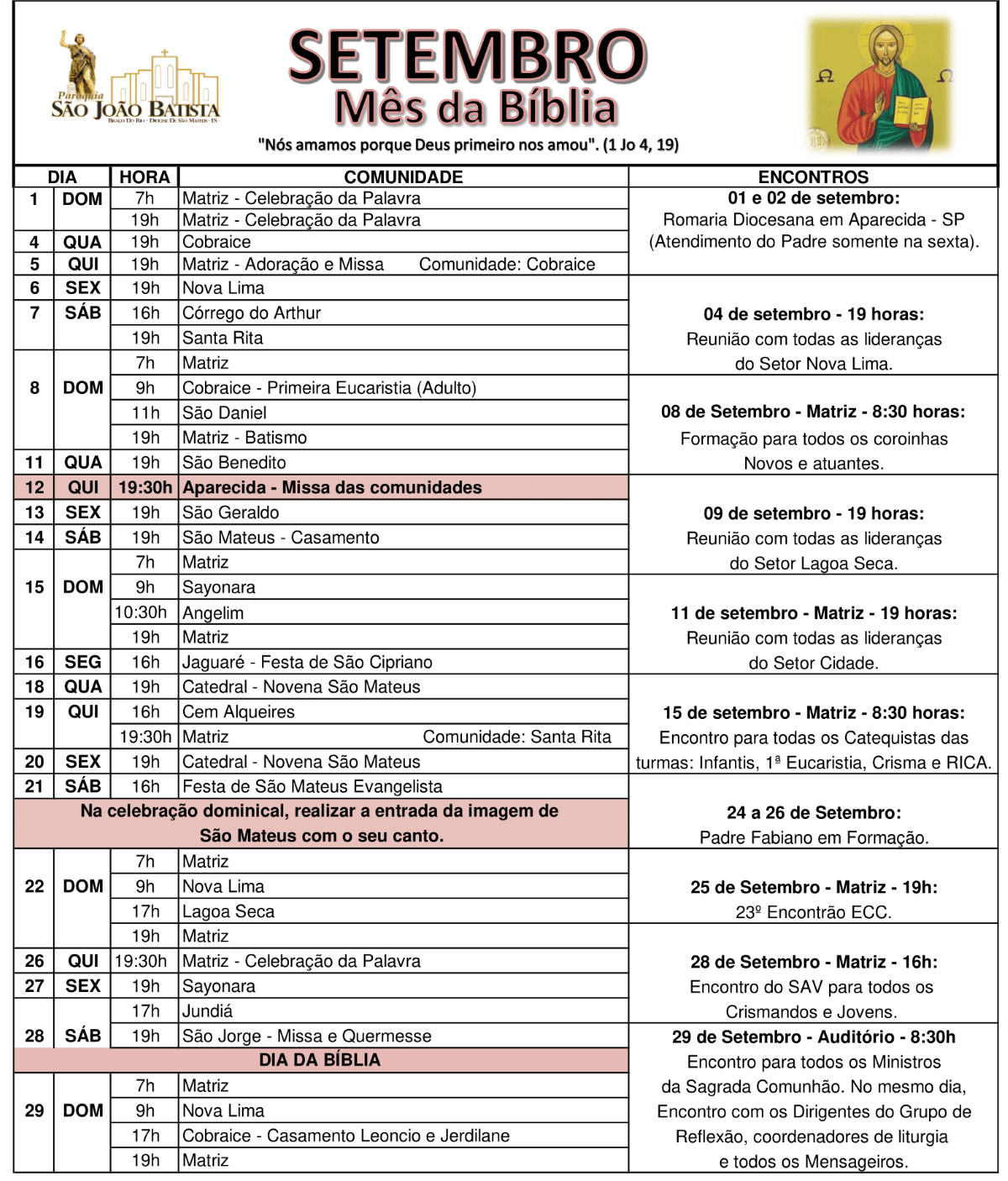 Programação Paroquial do Mês de Setembro 2019