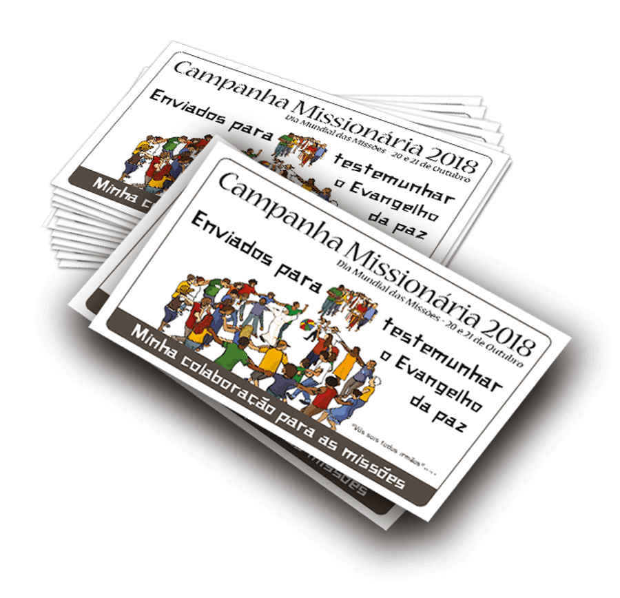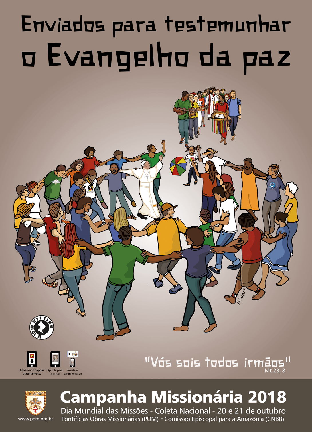 Em comunhão com a arte dos materiais da Campanha Missionária de 2017, neste ano destacamos o envio para testemunhar o Evangelho da Paz. A arte mostra a Igreja, Povo de Deus, formada por diferentes sujeitos da missão (leigos e leigas, consagrados e consagradas, diáconos, padres, bispos e o papa), representantes de todas as idades e etnias.