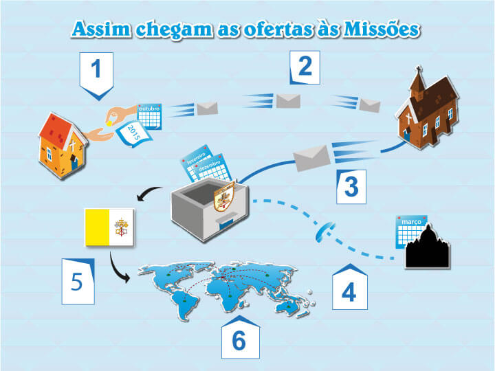 3. Até o final do ano ou no máximo até o mês de fevereiro, as dioceses repassam o valor total das ofertas para a direção nacional das Pontifícias Obras Missionárias (POM) em Brasília (DF).
