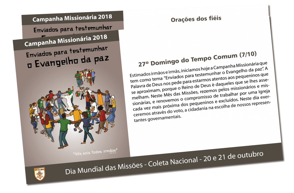 Com o tema “Enviados para testemunhar o Evangelho da paz”, o objetivo do mês missionário é sensibilizar, despertar vocações missionárias e realizar a Coleta no Dia Mundial das Missões, no penúltimo domingo de outubro (nos dias 20 e 21).