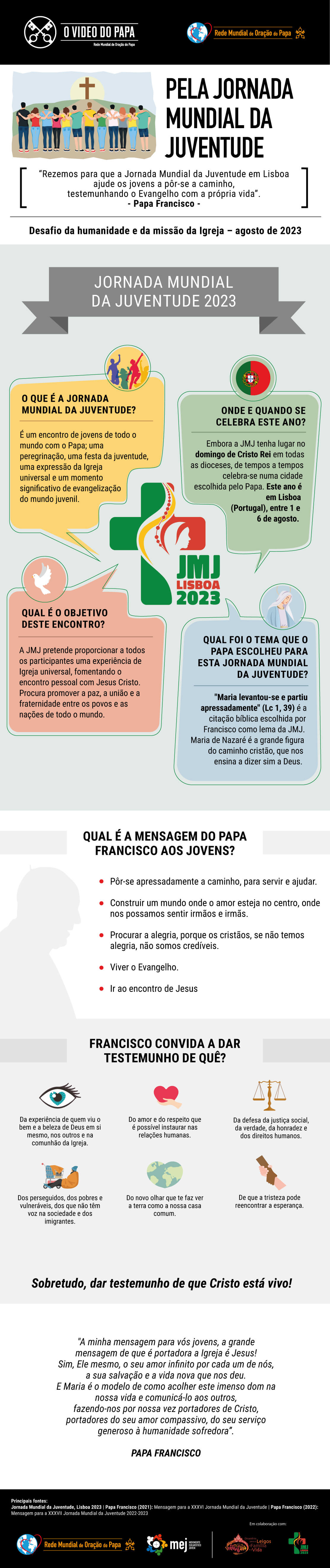 "Rezemos para que a Jornada Mundial da Juventude em Lisboa ajude-nos a caminhar, dando testemunho do Evangelho com nossa própria vida", conclui o vídeo com a intenção de oração do Papa para o mês de agosto.