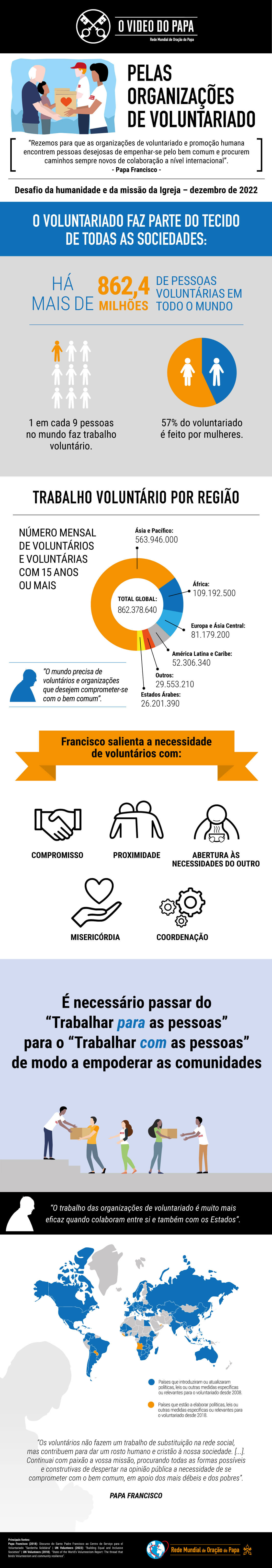 De acordo com o Programa de Voluntários das Nações Unidas (UNV), 1 em cada 9 pessoas no mundo é voluntária, com um total de 862,4 milhões de voluntários no mundo.