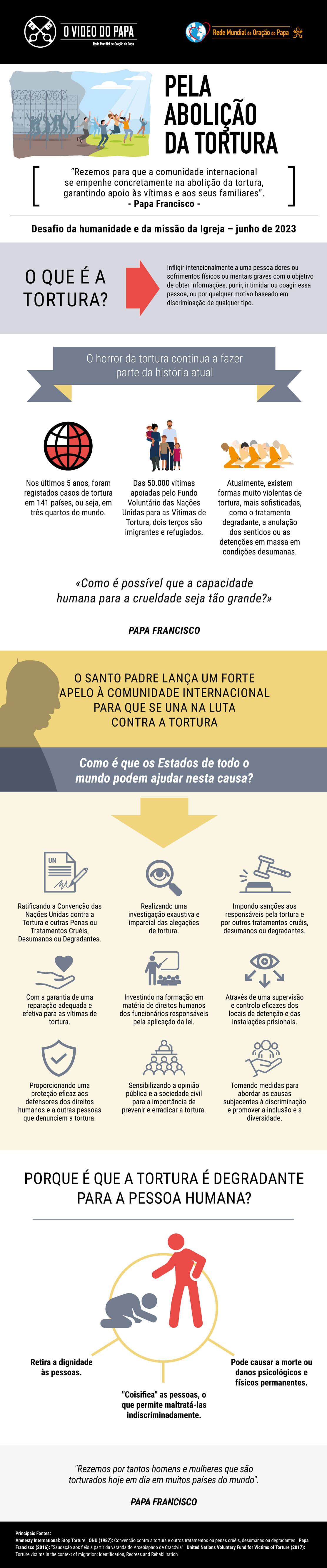 Imagens de presos em condições desumanas – amarrados a uma cadeira, encapuzados, com as mãos atadas – aparecem no Vídeo do Papa deste mês, que reconstrói lugares e práticas de tortura em vigor em várias partes do mundo. Baldes de água com trapos, cordas, baterias elétricas, alicates, martelos, facões... Esse inquietante inventário de uma hipotética sala de tortura acompanha as palavras de Francisco, e sublinha que quem tenta reduzir o homem a uma "coisa" perde, acima de tudo, a sua humanidade.