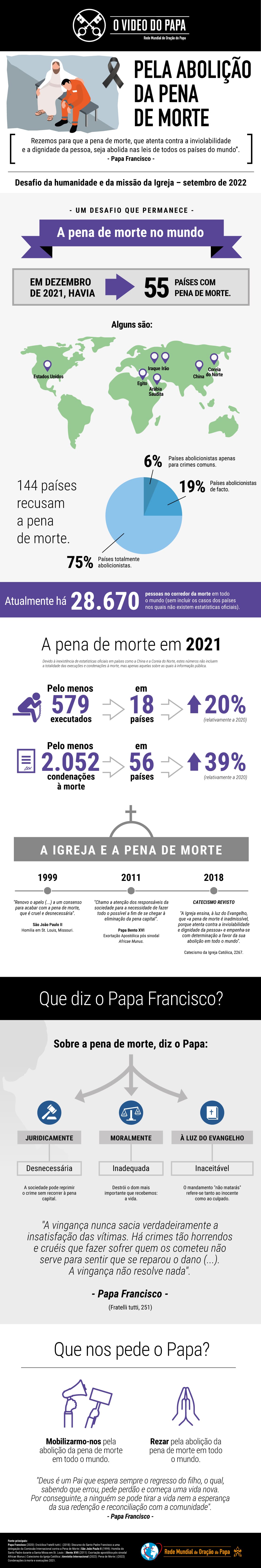 Assim o Pontífice inicia o Vídeo do Papa de setembro que pede pelo fim da pena de morte no mundo, uma intenção de oração que o Santo Padre confia à Igreja Católica através da Rede Mundial de Oração do Papa. Nesta edição, Francisco então indica que a rejeição a essa prática está aumentando no mundo, o que a Igreja vê como "um sinal de esperança". De fato, de acordo com dados das Nações Unidas, cerca de 170 Estados aboliram a pena de morte, impuseram uma moratória à sua utilização na lei ou na prática, ou suspenderam as execuções durante mais de 10 anos. No entanto, a pena de morte ainda é aplicada em 55 países, em vários continentes.
