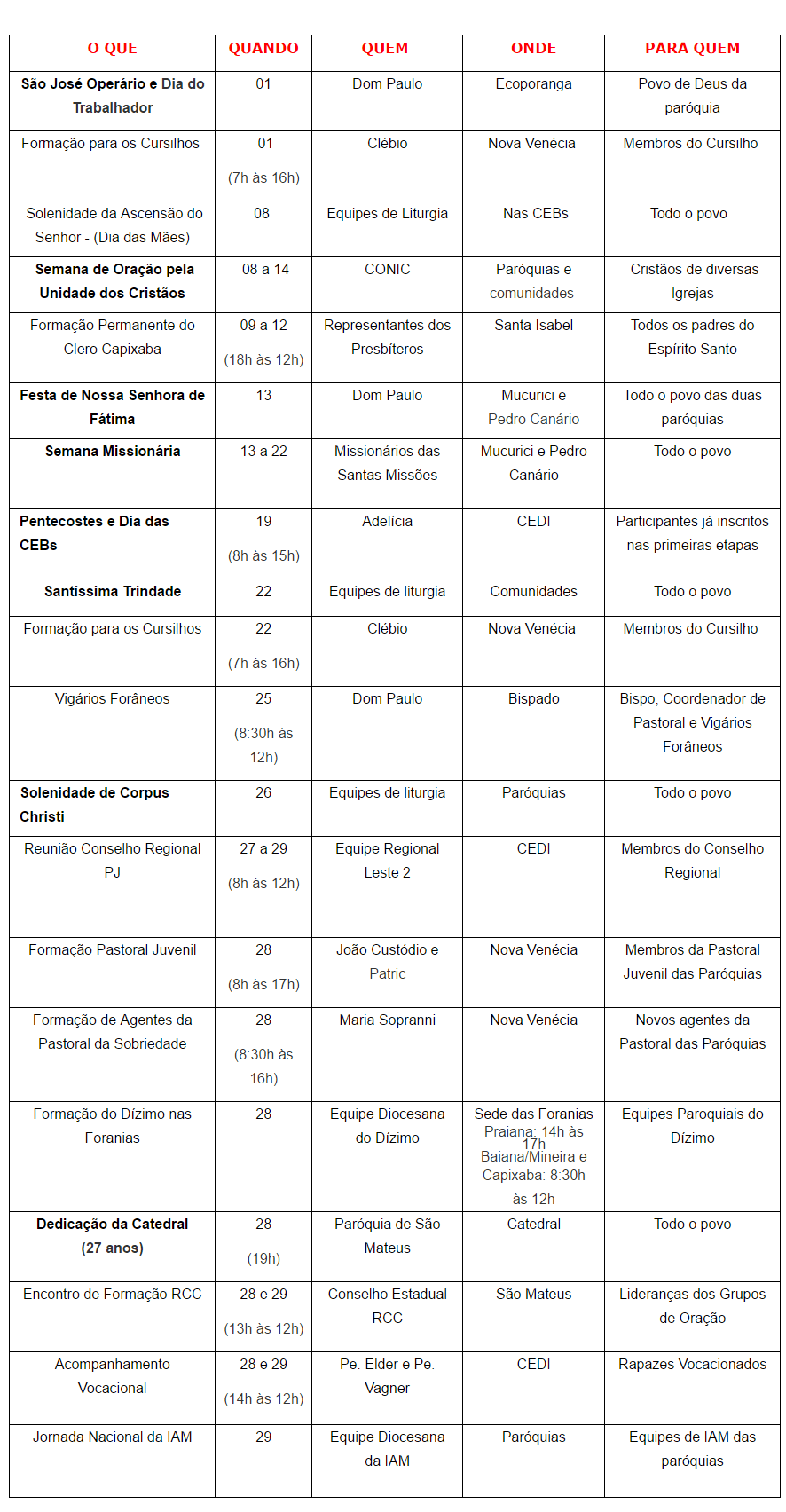 *Obs: O Calendário pode sofrer mudanças.  Fonte: Secretariado Diocesano de Pastoral - Diocese de São Mateus.