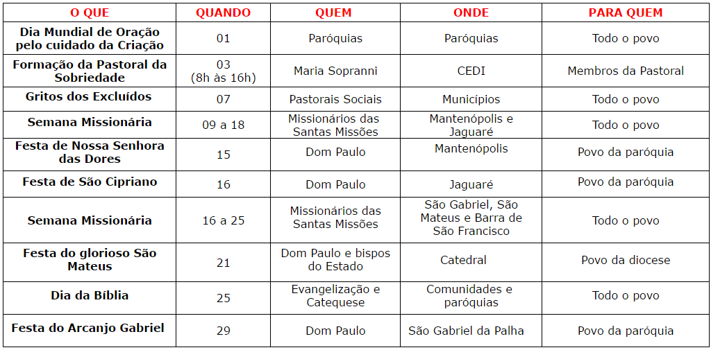 *Obs: O Calendário pode sofrer mudanças.  Fonte: Calendário Pastoral Diocesano - Diocese de São Mateus - ES - 2016.