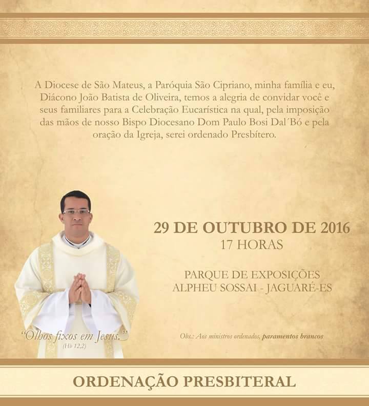 Confira a data e local da ordenação presbiteral do diácono João Batista