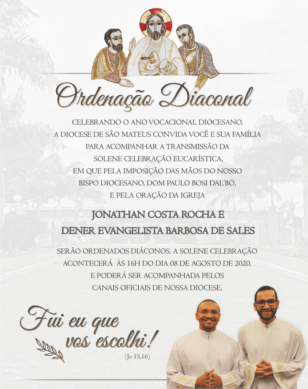 A Igreja não pode parar, pois a missão continua. Neste espírito, comunico a todos a NOVA DATA DE ORDENAÇÃO DIACONAL dos seminaristas estagiários Dener Evangelista Barbosa de Sales e Jonathan Costa Rocha: dia 08/08/2020, às 16h na Catedral Diocesana. Esta ordenação será diferente de nossas outras ordenações, pois deverá seguir as normas da vigilância sanitária e as orientações da CNBB para a celebração deste sacramento. Portanto, será restrita aos ministros ordenados, religiosos, religiosas, seminaristas, alguns membros das famílias dos ordenandos e alguns representantes de suas Paróquias de origem e do estágio pastoral.