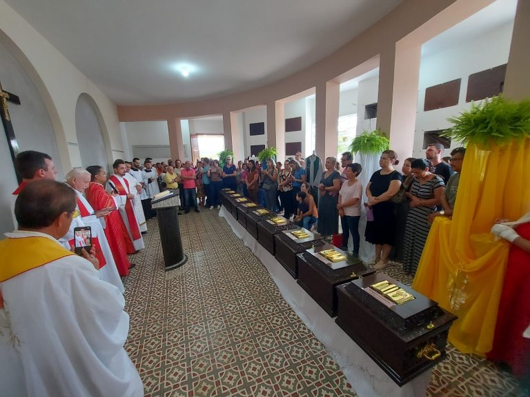 Esse ato foi realizado com grande reverência e respeito em um momento de oração no cemitério São Marcos, na cidade de Nova Venécia/ES, a partir dai, os restos mortais foram transportados em pequenos caixões pela funerária, diretamente para a Cripta(*), onde agora repousarão em paz.