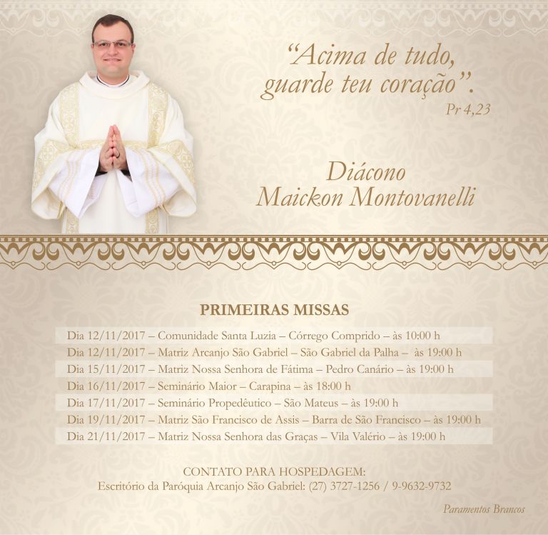 O diácono Maickon escolheu para lema de sua ordenação a passagem “Acima de tudo, guarde teu coração” (Pr 4,23). Maickon tem como origem a comunidade Santa Luzia, no Córrego Comprido em São Gabriel da Palha.