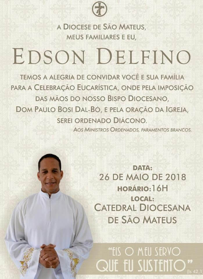 A ordenação acontecerá no dia 26 de maio de 2018, às 16h, na Catedral Diocesana em São Mateus e são esperados fiéis de toda nossa diocese.