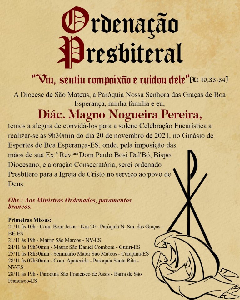 Em clima de grande alegria, e no espírito do ano vocacional diocesano, nossa Igreja Diocesana, no próximo dia 20 de Novembro do corrente ano, ordena Presbitério o Diác. Magno Nogueira. Pela imposição das mãos do nosso Bispo Diocesano, Dom Paulo Bosi Dal’Bó, e oração Consecratória, o Diác. Magno se tornará Padre para o serviço ao povo santo de Deus em nossa querida Diocese de São Mateus. Esta Ordenação, mesmo que ainda em tempo de pandemia, já contará com a presença do povo em quantidade mais irrestrita, levando em consideração os índices da Pandemia da Covid 19 em queda e o avanço da Vacinação na região.