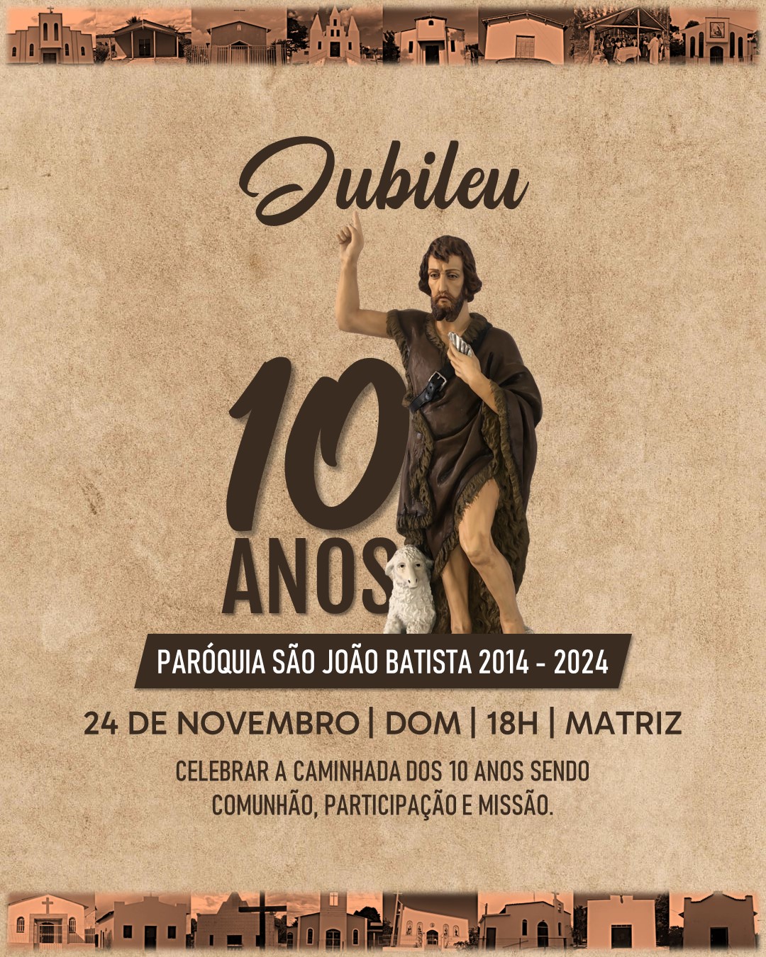 Neste mês, com grande alegria celebramos o Jubileu de 10 anos de nossa Paróquia. Celebramos uma década de caminhada! Uma jornada de comunhão, participação e missão que nos uniu e fortaleceu. Cada passo dado juntos nos trouxe até aqui. Vamos celebrar não apenas o que já fizemos, mas principalmente o que ainda está por vir! Até aqui o Senhor nos sustentou.