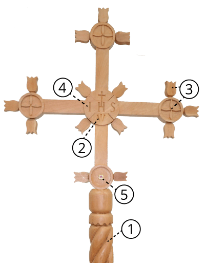 Cruz missionária A cruz missionária recorda a Páscoa de Jesus que ilumina nossa vida e missão. 1. A haste está em forma de espiral ascendente. Recorda o movimento característico da missão, da encarnação em direção a Páscoa de Jesus, crucificado e ressuscitado que ilumina e transformando a realidade. 2. Os cravos, testemunham o martírio de Jesus na Cruz. 3. As flores que brotam da cruz, representam a vida nova que nasce da Páscoa de Jesus Cristo. Em meio a dor e sofrimento, Deus se manifesta e faz ressurgir a esperança e alegria do Evangelho. 4. A inscrição IHS, significa: Jesus, Filho de Deus, Salvador dos Homens. 5. Relíquia de Santa Nazária, fundadora de uma Congregação Missionária feminina na Bolívia.