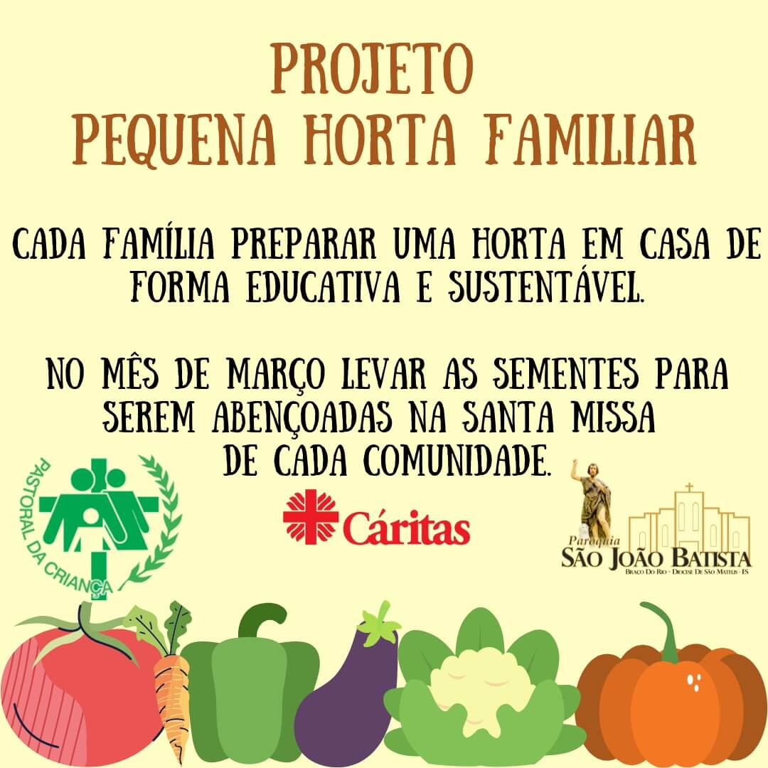O projeto da Horta Familiar foi lançado em Fevereiro de 2021, mas não tivemos como dar continuidade devido as restrições da pandemia. Nossa Paróquia e Pastorais convidam a retomarmos essa iniciativa educativa em nossas famílias. Escolham suas sementes e levem para as missas do mês de março para serem abençoadas.