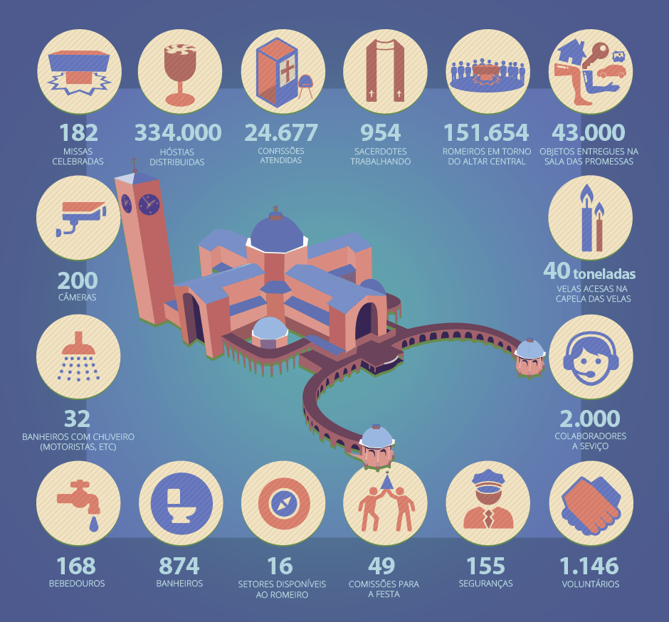 O Portal A12.com preparou um infográfico mostrando a quantidade de missa celebradas, o número de padres servindo, de objetos entregues na sala das promessas, o movimento de romeiros em torno do Altar Central, a quantidade de velas acesas e ainda outros números do mês de outubro, esse momento especial para o povo brasileiro devoto de Nossa Senhora.